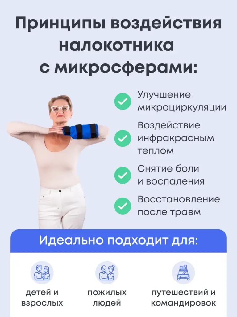 Налокотник предназначен для использования в домашних условиях для расслабления мышц локтевого сустава при ощущении дискомфорта, после занятий спортом и физических нагрузок.